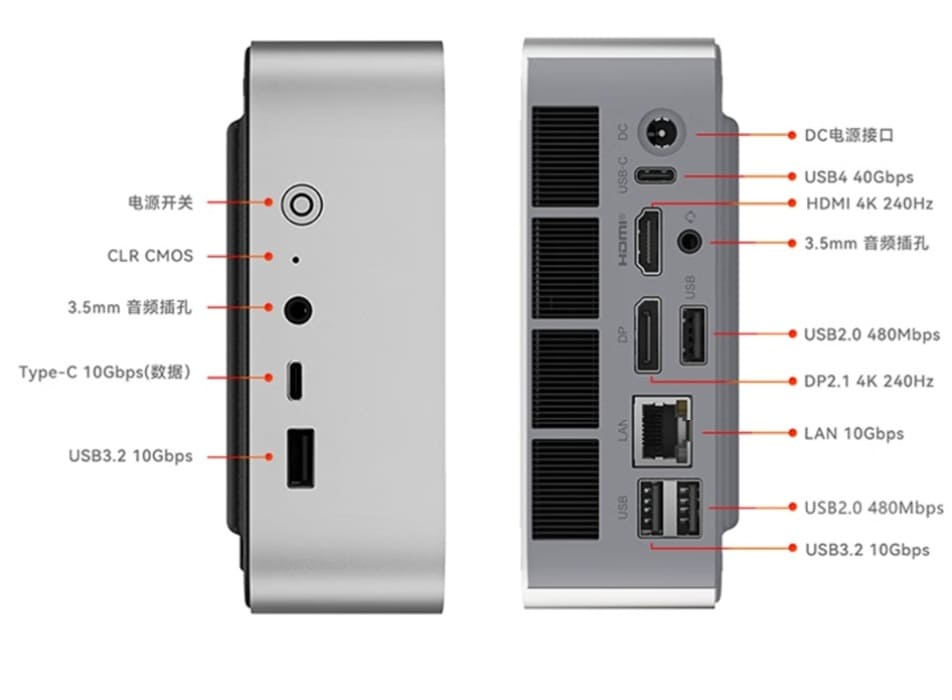 El chasis conserva unas dimensiones de 135 × 135 × 44,7 mm y un peso de 780 g, con un sistema de refrigeración MSC 2.0 capaz de elevar el APU hasta 65W sostenidos. La conectividad es uno de los puntos más fuertes: USB4 40 Gb/s, DisplayPort 2.1, LAN 10 GbE, HDMI y varios USB adicionales tanto en el frontal como en la parte trasera.