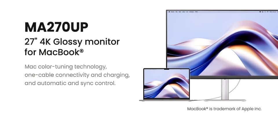 El monitor utiliza un panel 4K UHD de 27 pulgadas, con espacio de color P3 y tecnología iDevice Color Sync, que sincroniza automáticamente los perfiles de color entre dispositivos Apple para garantizar una representación uniforme. El diseño mantiene el estilo minimalista característico de la gama MA, con conexión USB-C de un solo cable, soporte para carga rápida y un soporte ergonómico ajustable en altura, inclinación, giro y pivote.