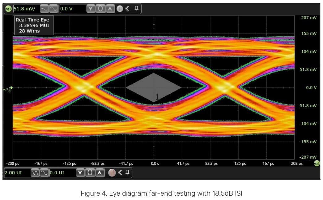 Para verificar la robustez del enlace, los ingenieros de Cadence realizaron pruebas de eye diagram con 18,5 dB de ISI, obteniendo una señal limpia y estable a 4,8 Gbit/s. Este resultado respalda la fiabilidad del conjunto PHY + controlador en escenarios de alta velocidad, un punto crítico para dispositivos de IA sensibles a errores de transmisión.