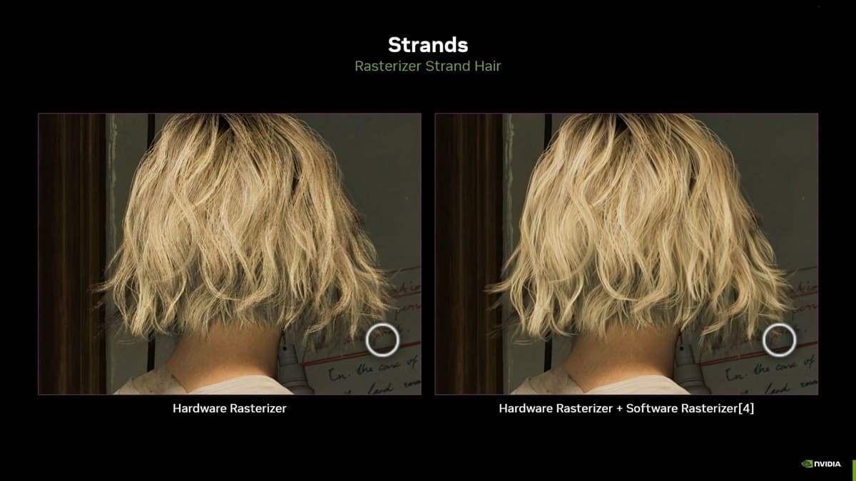 El tratamiento del cabello ha sido otro punto crítico. El motor utiliza strand hair propietario, combinando rasterización hardware con un paso de software para transparencias finas, lo que complica su integración en ray tracing.