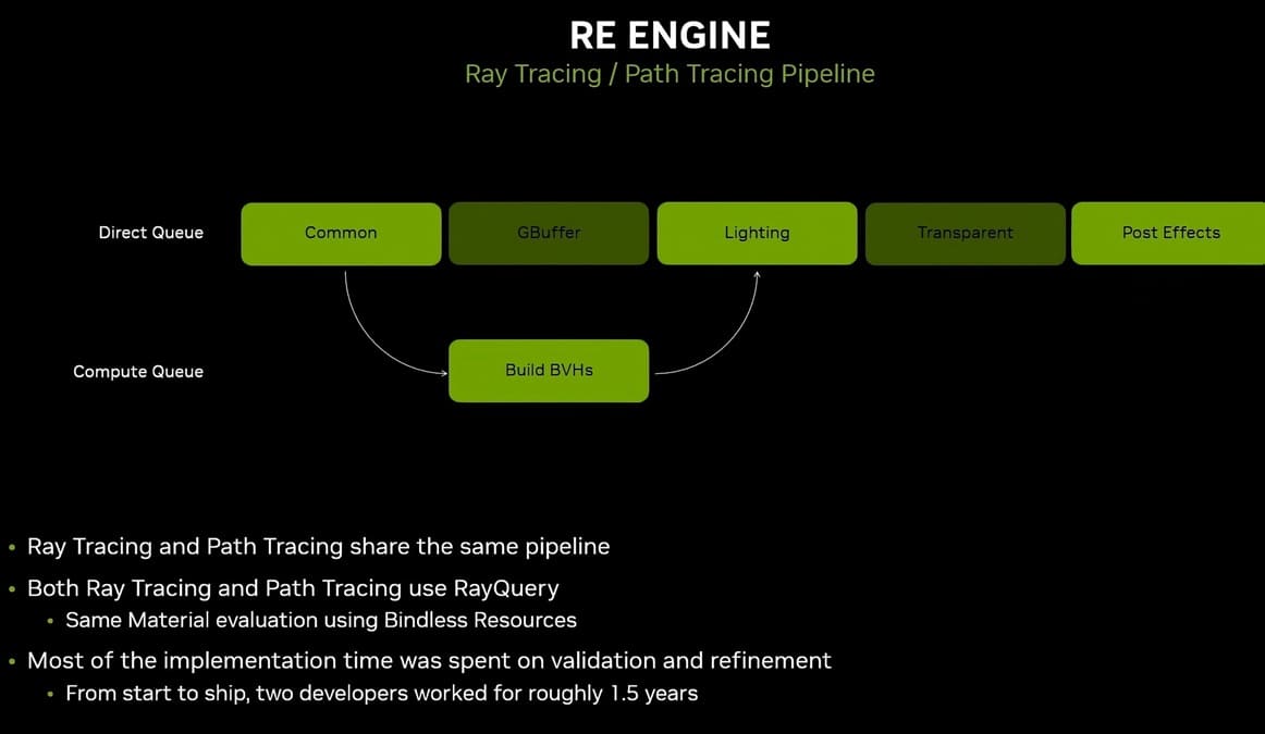 Además, procesos como la construcción de BVH (Bounding Volume Hierarchy) se ejecutan como cómputo asíncrono, compartiendo infraestructura entre ray tracing y path tracing, lo que optimiza el flujo general del motor.