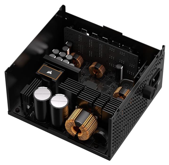 En su interior, Corsair utiliza condensadores japoneses de 105 °C y una topología resonante LLC con conversión DC-DC, asegurando potencia estable, limpia y duradera incluso en sistemas de alto rendimiento o uso continuo.