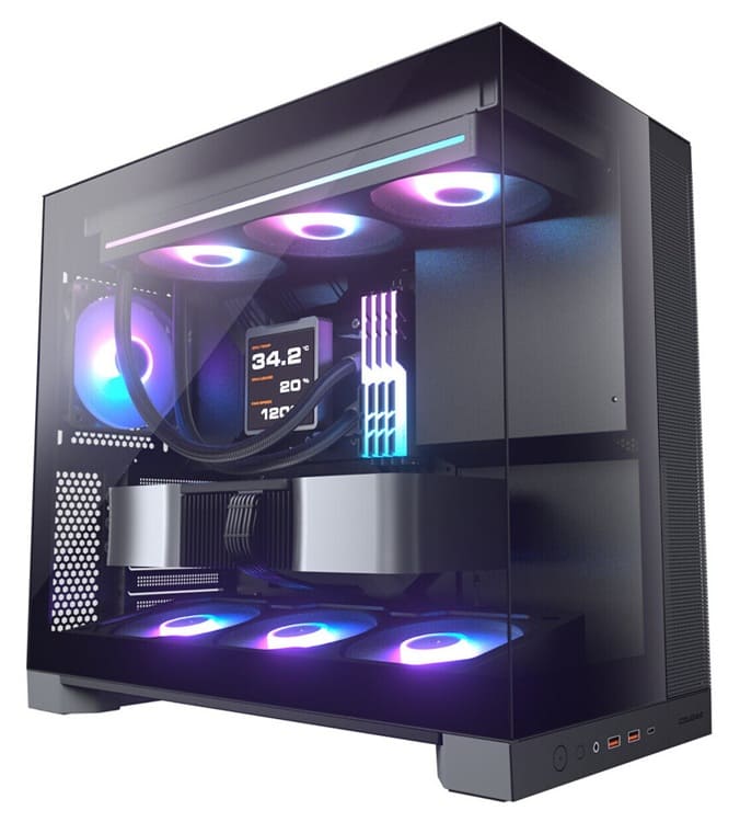 El CFV235-G representa una de las interpretaciones más radicales del enfoque térmico de COUGAR. Este chasis introduce la estructura Central Floating Ventilation (CFV), una partición suspendida entre la fuente y la cámara principal que convierte el espacio vacío en un canal activo de ventilación. El resultado es una ampliación real de las rutas de entrada de aire, con un diseño panorámico dominado por cristal y una estética marcada, pensada tanto para exhibición como para sistemas de alto rendimiento. Esta versión concreta se muestra como exclusiva de CES para Estados Unidos.