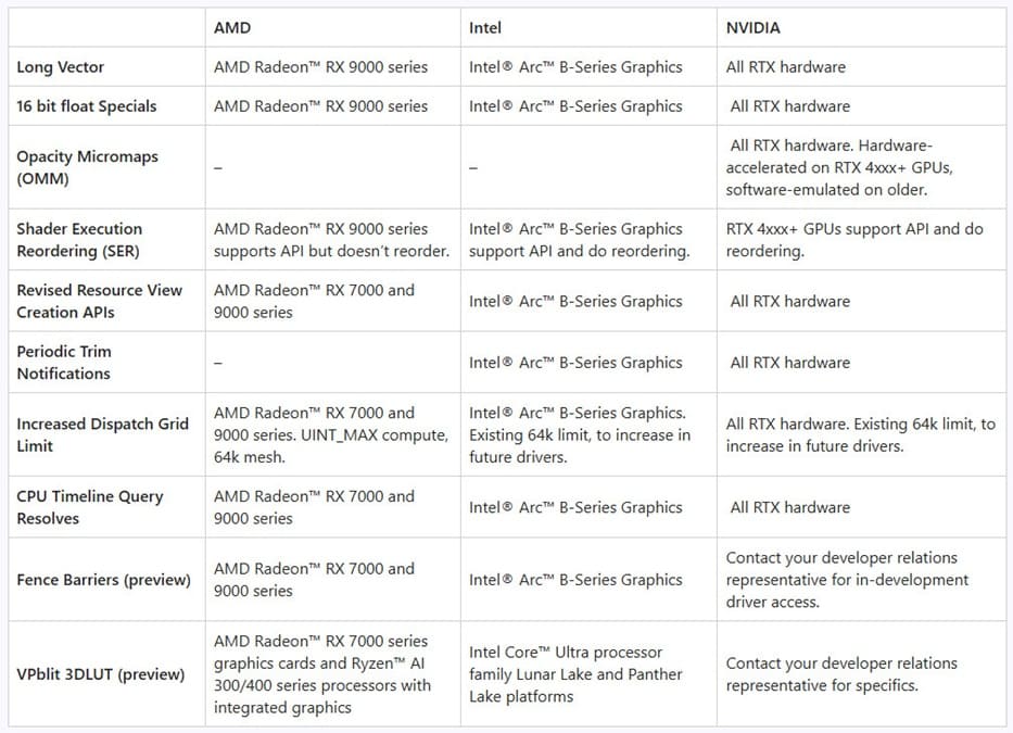 La actualización también incluye una tabla comparativa de compatibilidad entre fabricantes de GPU, mostrando el soporte de Shader Model 6.9 en hardware de AMD, NVIDIA e Intel, un paso clave para facilitar la adopción del nuevo estándar dentro de la industria.