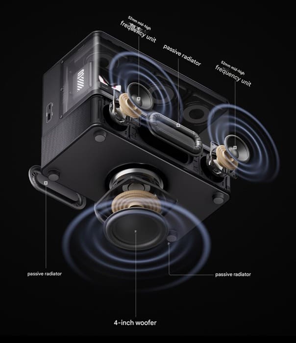Los cables trenzados del altavoz recuerdan a los tubos de refrigeración líquida, reforzando el efecto visual. En la parte trasera se encuentran puertos USB-C y USB-A, capaces de suministrar hasta 35W de carga a dispositivos externos, como móviles o tablets.