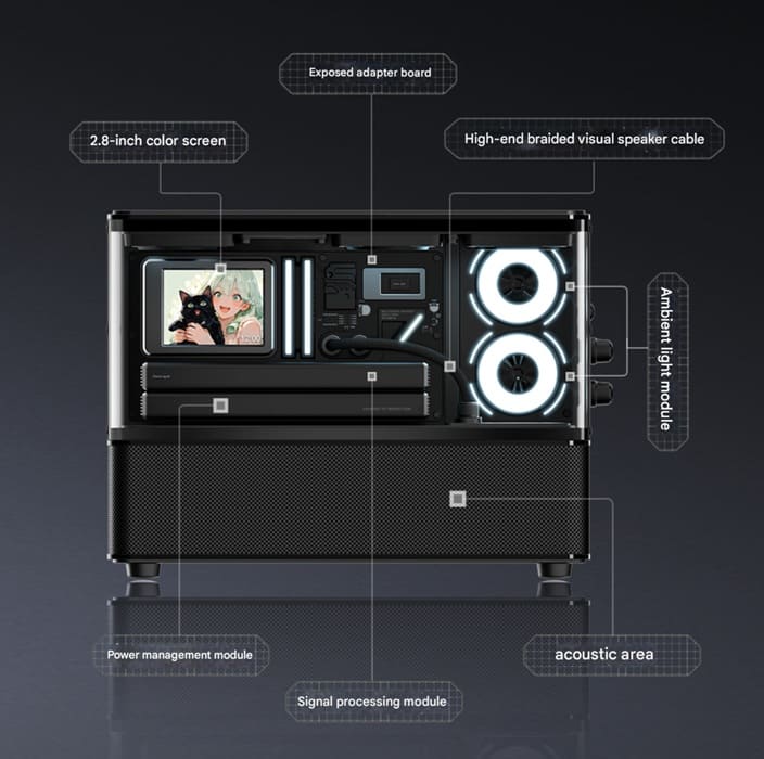 A primera vista, el Edifier New Cyber podría pasar perfectamente por un ordenador compacto de gama alta. Su mitad superior es transparente, permitiendo ver los módulos internos que imitan tarjetas gráficas, ventiladores y memoria RAM, todos recreados con luces LED animadas.