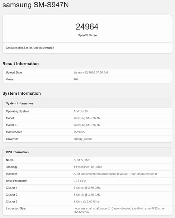 El Galaxy S25+ con identificador SM-S947N, destinado al mercado surcoreano, ha sido detectado en Geekbench 6 con un resultado OpenCL de 24.964 puntos. Esta cifra sitúa al Exynos 2600 aproximadamente un 21,8% por encima del Snapdragon X Elite, que alcanza 20.492 puntos en la misma prueba ejecutada sobre un Galaxy Book4 Edge.
