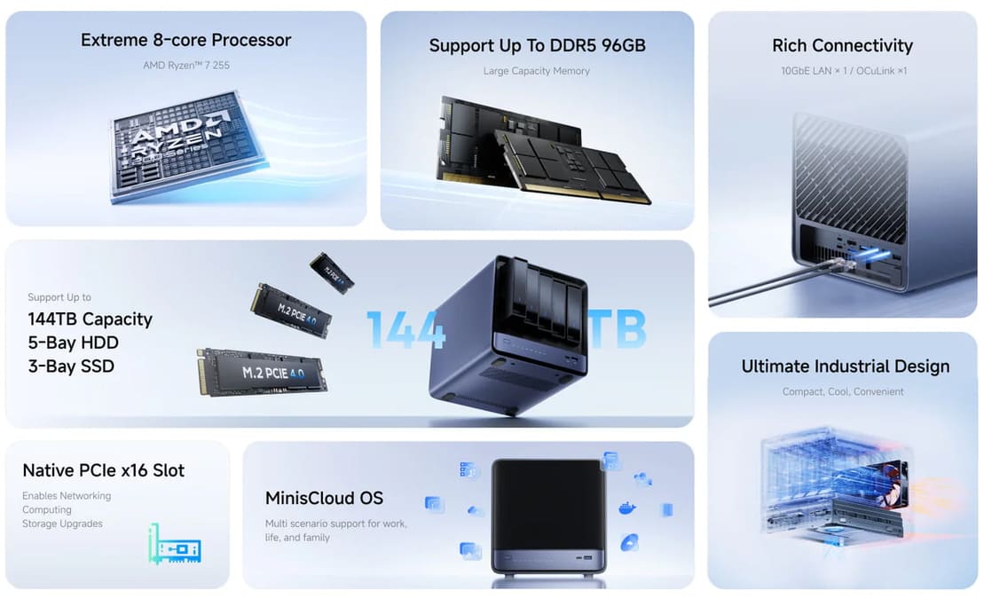 Uno de los datos más relevantes es el soporte de hasta 144 TB de almacenamiento, una cifra poco habitual en equipos compactos de este tamaño. El sistema cuenta con cinco bahías para unidades de 3,5 pulgadas, además de tres ranuras M.2 compatibles con SSD PCIe 4.0, lo que permite combinar gran capacidad y alto rendimiento en una misma plataforma.