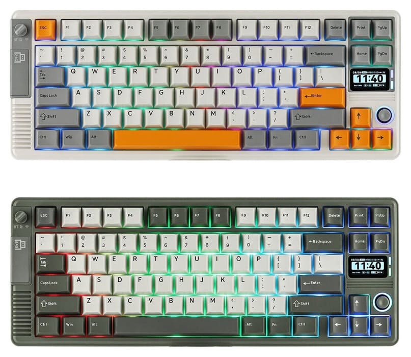 El Epomaker RT85 es el nuevo integrante de la serie RT y toma como base las ideas del RT100, manteniendo el enfoque en la interacción mediante una pantalla TFT superior y controles físicos adicionales. El diseño apuesta por una estética retro deliberada con dos combinaciones cromáticas: verde suave con blanco y blanco vintage con gris y acentos naranja, orientadas a quienes buscan un aspecto clásico sin renunciar a funciones modernas.