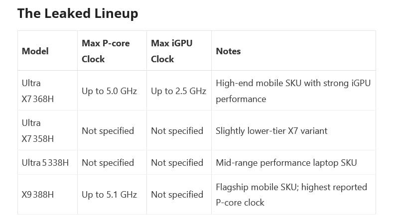 El Ultra X7 368H alcanzaría 5,0 GHz con GPU a 2,5 GHz, mientras que el X9 388H se situaría como el buque insignia con 5,1 GHz. El Ultra 5 338H estaría orientado a portátiles de gama media.
