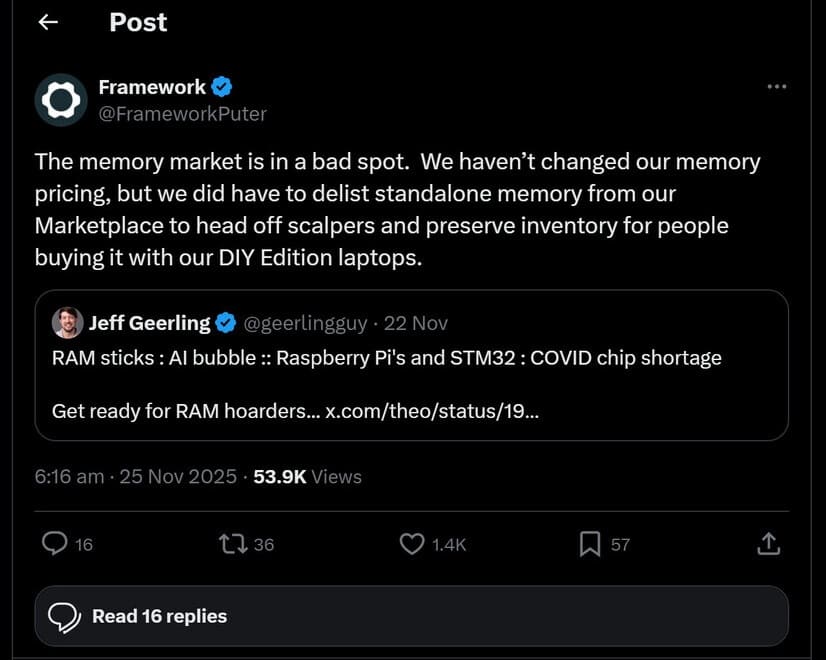Según un comunicado publicado en redes sociales, la firma explicó: “El mercado de la memoria se encuentra en una mala situación. No hemos modificado nuestros precios, pero hemos tenido que retirar la memoria independiente de nuestro Marketplace para evitar la reventa y preservar el inventario destinado a quienes compran nuestros portátiles DIY Edition.”