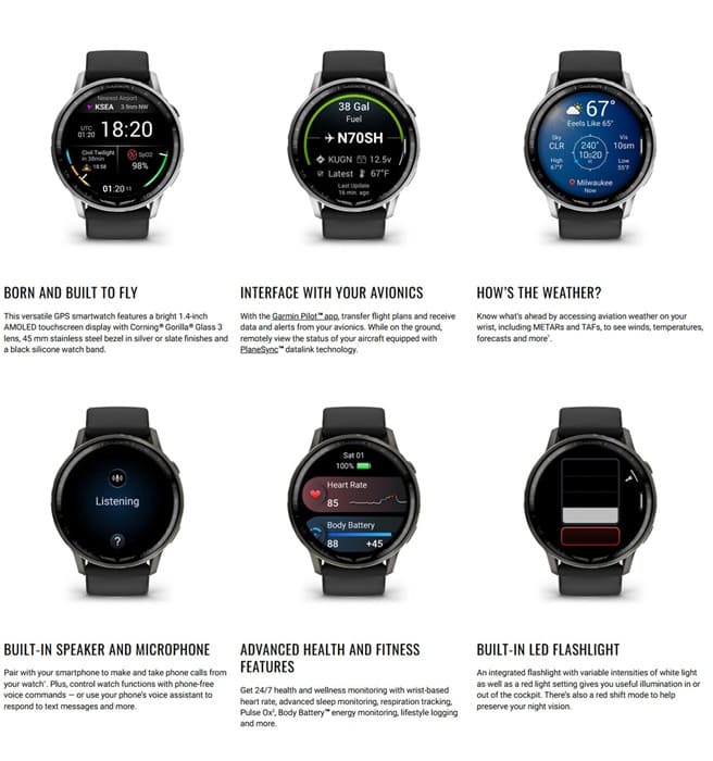 Además, el dispositivo es capaz de sincronizarse con avionics compatibles, ofreciendo alertas en tiempo real y datos de ruta. También hereda funciones del Venu 4, como el control por voz, la aplicación Garmin Messenger y una amplia gama de modos deportivos, junto con sensores de oxígeno en sangre, ritmo cardíaco, estrés, sueño y energía corporal.