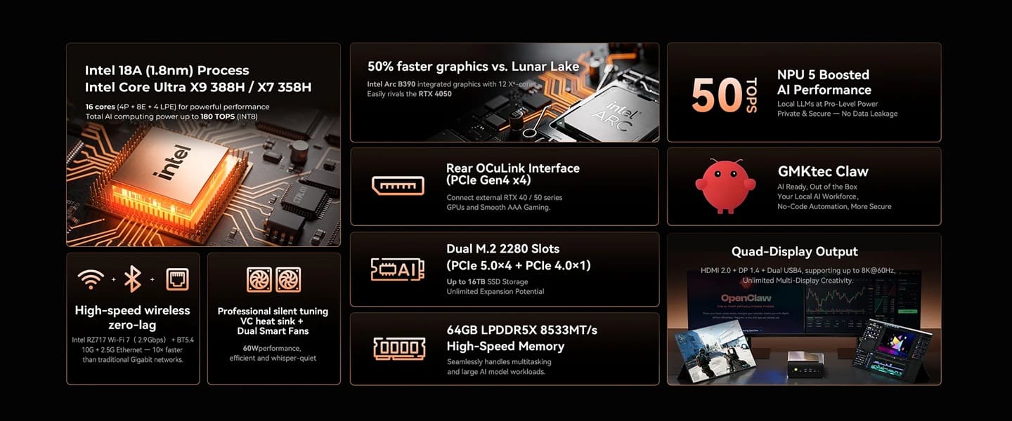 El GMKtec EVO-T2 estará disponible con los procesadores Core Ultra X7 358H y Core Ultra X9 388H, ambos con una configuración de 16 núcleos y 16 hilos basada en 4 P-core, 8 E-core y 4 LP-E-core, lo que permite equilibrar rendimiento y eficiencia energética en cargas de trabajo mixtas como IA, productividad avanzada y multitarea intensiva en un mismo sistema compacto.