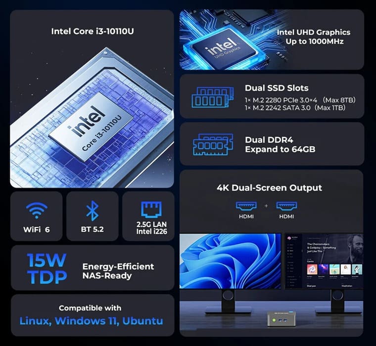 GMKtec ha incorporado a su catálogo el NucBox G3 Pro, un mini PC orientado a uso doméstico y productividad básica que apuesta por una plataforma ya conocida pero contenida en consumo. El sistema se basa en el Intel Core i3-10110U, integrado en un chasis de 114 × 106 × 44 mm con un peso aproximado de 280 g, lo que lo sitúa claramente en el segmento de equipos compactos para escritorio o uso continuo.