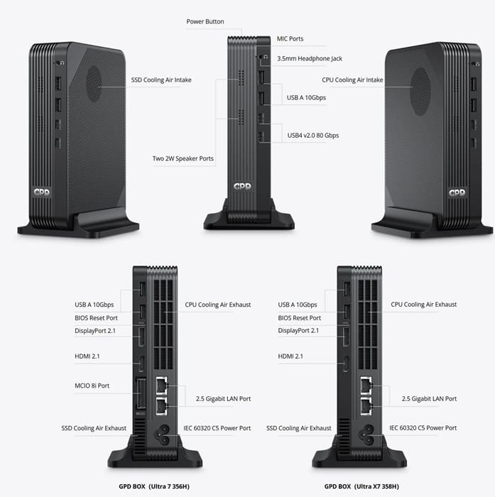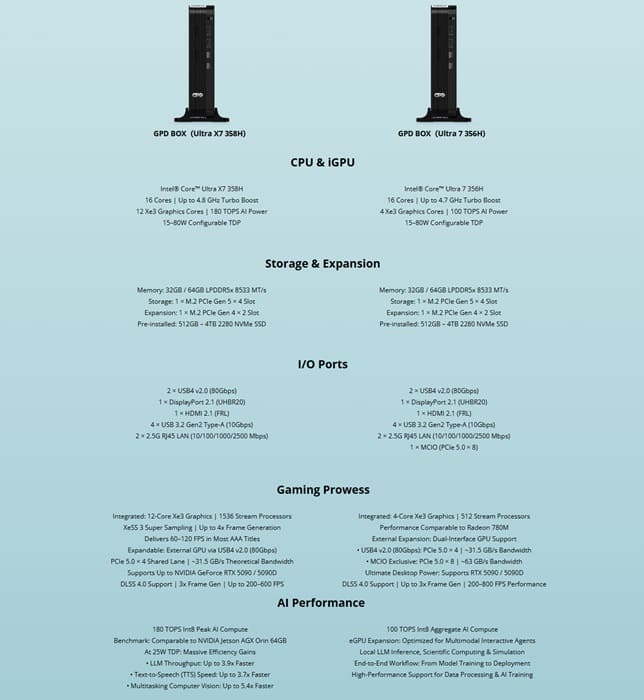 El GPD Box se apoyará en dos configuraciones basadas en procesadores Intel Panther Lake, concretamente el Core Ultra X7 358H y el Core Ultra 7 356H, lo que define dos perfiles de usuario bastante distintos.
