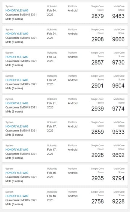 Como es habitual, Geekbench identifica los dispositivos mediante número de modelo en lugar de su denominación comercial. Sin embargo, Honor ya había confirmado que la MagicPad 4 corresponde al identificador YLE-W09, lo que permite asociar con bastante seguridad los resultados filtrados al dispositivo final que llegará al mercado.