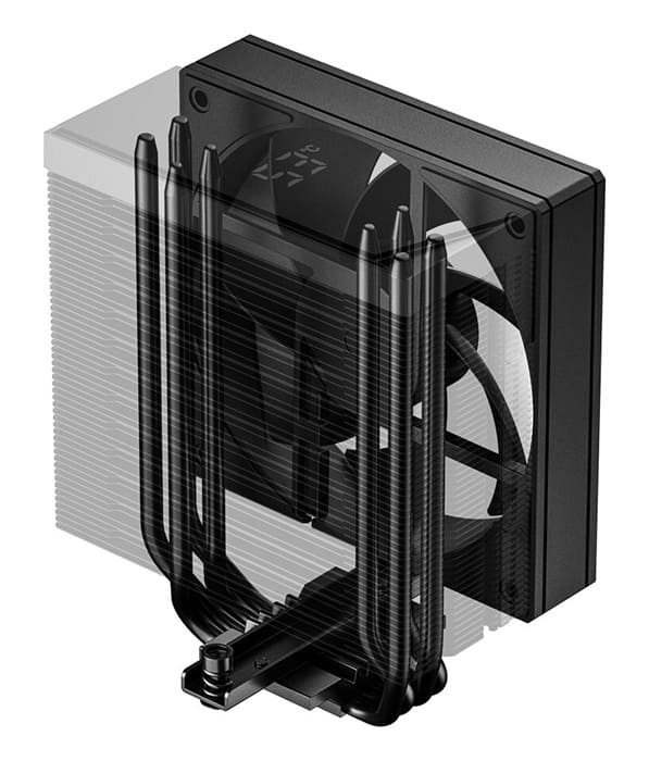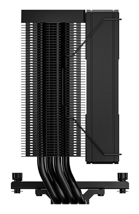 El sistema de refrigeración se basa en cuatro heatpipes de contacto directo, combinados con una torre de 53 aletas de aluminio con recubrimiento negro y un grosor de 50 mm, lo que permite disipar hasta 220W de TDP. Este diseño asegura una transferencia térmica uniforme y estable incluso en procesadores de gama alta.