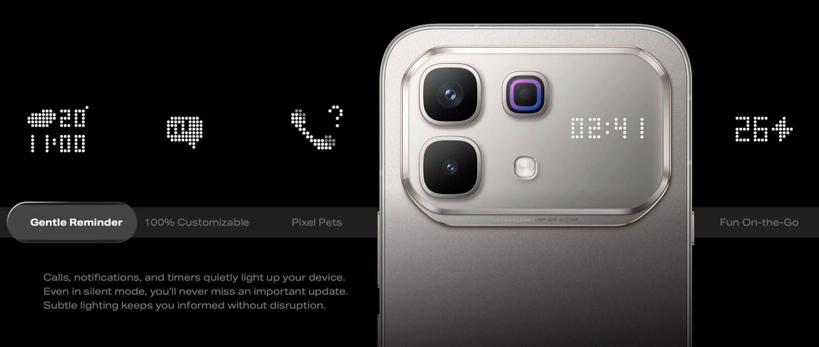 Entre las novedades destaca un botón de acción programable, capaz de activar un asistente de IA, abrir la cámara u otras funciones configurables por el usuario. Además, el módulo trasero integra una pantalla de matriz de puntos, que puede mostrar notificaciones entrantes, la hora o incluso una mascota virtual, aportando un componente visual distintivo.