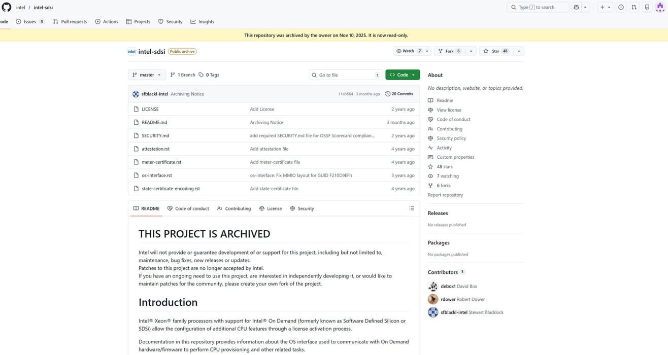 Intel ha puesto punto final, de forma discreta, a su iniciativa Software Defined Silicon (SDSi), también conocida como Intel On Demand. Según un informe publicado por Phoronix, la compañía ha archivado el repositorio oficial en GitHub asociado a este proyecto, lo que en la práctica confirma su abandono definitivo.