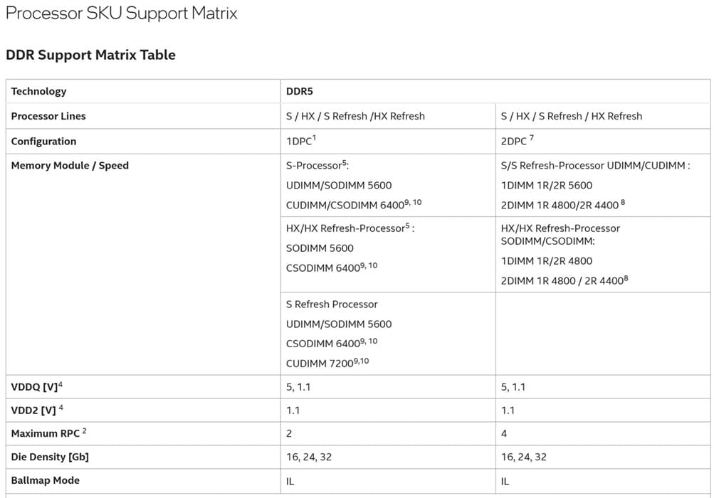 La firma Intel ha actualizado su matriz de compatibilidad de procesadores y memorias DDR5, confirmando oficialmente que la próxima serie Arrow Lake Refresh (ARLR) ofrecerá soporte nativo para velocidades de hasta 7200 MT/s en módulos CUDIMM. Esta mejora en la frecuencia de memoria marca un paso adelante respecto a las especificaciones anteriores, donde las memorias UDIMM y CSODIMM permanecían limitadas a 5600 MT/s y 6400 MT/s, respectivamente.