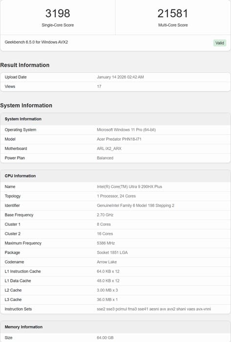 Donde realmente destaca esta nueva filtración es en los resultados de rendimiento. El Core Ultra 9 290HX Plus alcanza 3.198 puntos en single-core y 21.581 puntos en multi-core, unas cifras que lo colocan muy cerca de CPUs de escritorio de primer nivel como el AMD Ryzen 9 9950X3D o el Core Ultra 9 285K.