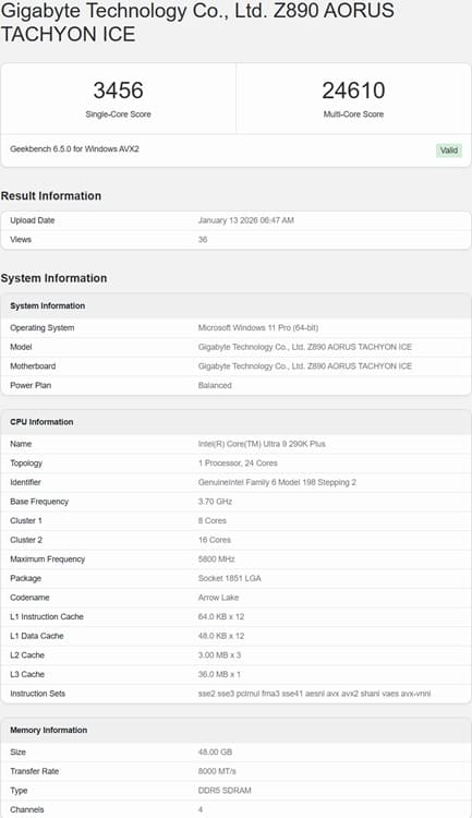 La prueba se realizó sobre una Gigabyte Z890 AORUS Tachyon ICE, acompañada de 48 GB de memoria DDR5 de 8.000 MT/s, una configuración claramente orientada a exprimir el máximo potencial del procesador. En este entorno, el Core Ultra 9 290K Plus registró 3.456 puntos en single-core y 24.610 puntos en multi-core.