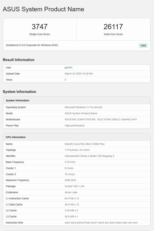 Las nuevas entradas detectadas por @9550pro en Geekbench sitúan al Ultra 9 290K Plus en una liga propia. El chip ha alcanzado los 3.747 puntos en las pruebas de un solo núcleo y unos impresionantes 26.117 puntos en multicore. Estas cifras suponen una mejora de rendimiento de casi el 17% respecto al actual Core Ultra 9 285K, ensanchando la brecha generacional de forma mucho más agresiva de lo que se preveía en las primeras filtraciones de hardware de este año.