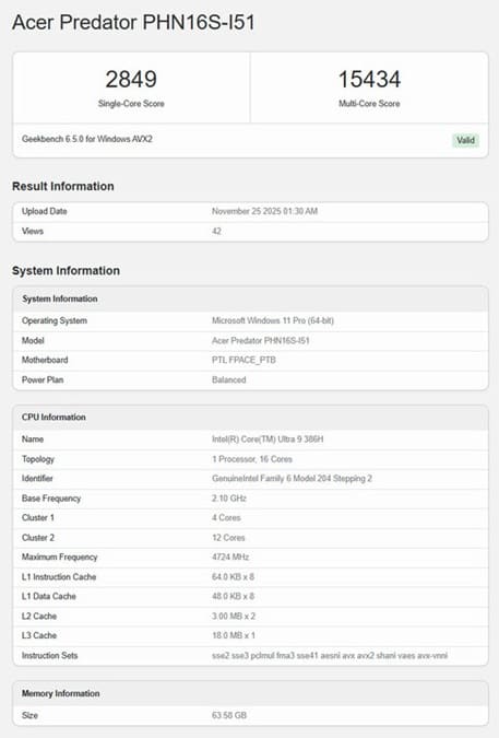 Un nuevo Intel Core Ultra 9 386H ha sido detectado en la base de datos de Geekbench 6.5, dentro de un portátil Acer Predator PHN16S-I51, posiblemente un modelo Helios de nueva generación. El sistema, equipado con 64 GB de memoria y Windows 11 Pro, revela que se trata de una muestra de ingeniería (ES) con 16 núcleos repartidos en 4 P-Cores, 8 E-Cores y 4 LPE-Cores. En las pruebas ha obtenido 2849 puntos en mononúcleo y 15 434 en multinúcleo, cifras que lo sitúan ligeramente por encima del actual Core Ultra 9 285H Arrow Lake-H.