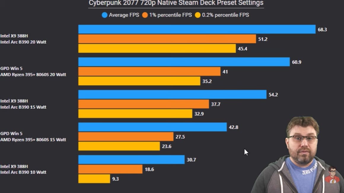 Este comportamiento se repite en otros títulos exigentes como Deus Ex: Mankind Divided, Doom: The Dark Ages y nuevamente Cyberpunk 2077 usando el preset de Steam Deck, consolidando la fortaleza de Intel en escenarios de consumo contenido.
