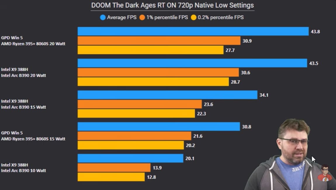 Las pruebas a 1080p confirman el patrón. Frente al Ryzen AI Max+ 395, el Core Ultra X9 388H se muestra claramente más rápido tanto a 15W como a 20W. A 15W, Intel alcanza 29,3 FPS, frente a los 22,6 FPS de la APU de AMD. A 20W, ambos chips mejoran, pero Intel mantiene una ventaja del 23%, con 37,8 FPS frente a 30,7 FPS.