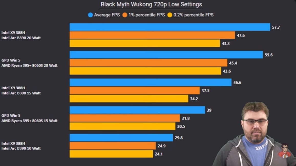 Los benchmarks compartidos por The Phawx refuerzan esta tendencia. En Black Myth: Wukong, el Core Ultra X9 388H logra 30 FPS a 720p en calidad baja con solo 10W, una cifra especialmente destacable.