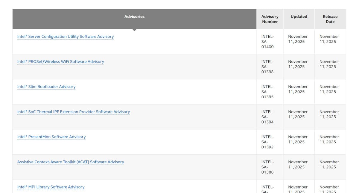 Intel ha lanzado una nueva actualización de microcódigo (versión 20251111) acompañada por 30 avisos de seguridad que afectan a una amplia gama de productos, incluyendo procesadores Core de 12ª a 14ª generación, la familia Core Ultra móvil y varias líneas Xeon Scalable de cuarta a sexta generación.