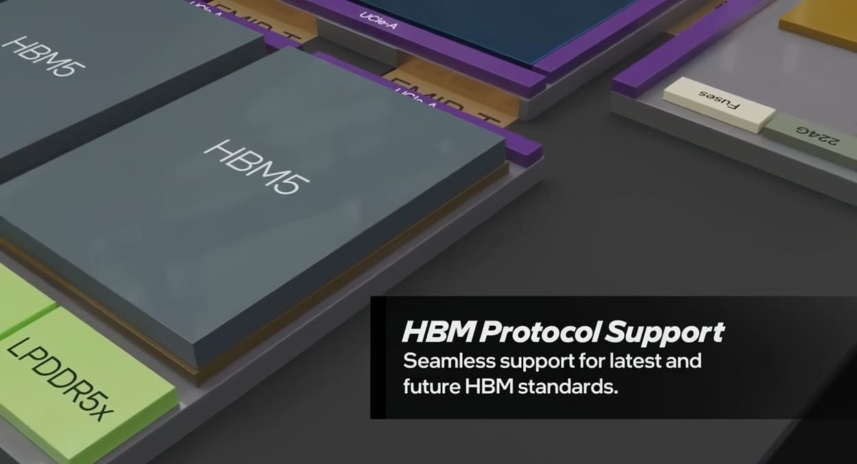 Uno de los aspectos más llamativos del concepto es su enfoque en memoria. Intel ha visualizado dos configuraciones extremas. La primera integra cuatro compute tiles junto a 12 posiciones HBM, mientras que la más ambiciosa escala hasta 16 compute tiles y 24 sitios HBM. Estas posiciones son compatibles tanto con HBM3 y HBM3E como con estándares futuros como HBM4, HBM4E o incluso HBM5.