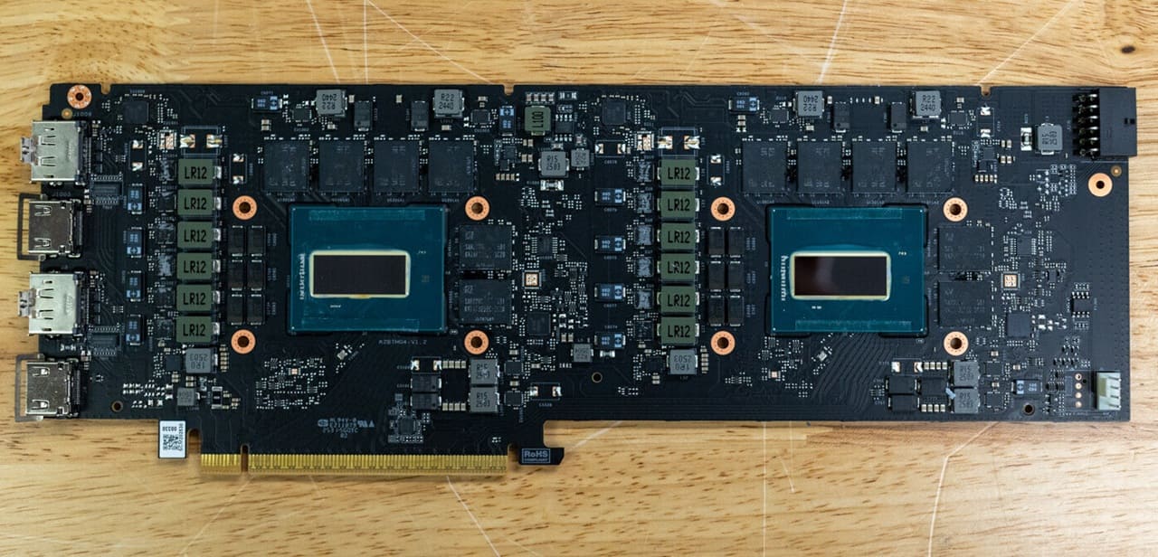 El modelo probado pertenece a Maxsun, socio autorizado de Intel, que ha creado una tarjeta gráfica de doble slot con refrigeración tipo turbina denominada Turbo Fan Edition. Este diseño incorpora dos GPUs Battlemage B60 en una misma PCB, con una longitud de 300 mm y un consumo conjunto de 400W, alimentado por un conector 12V-2×6 de 600W. El objetivo es mantener temperaturas estables en estaciones de trabajo o racks industriales, garantizando rendimiento sostenido bajo carga continua.