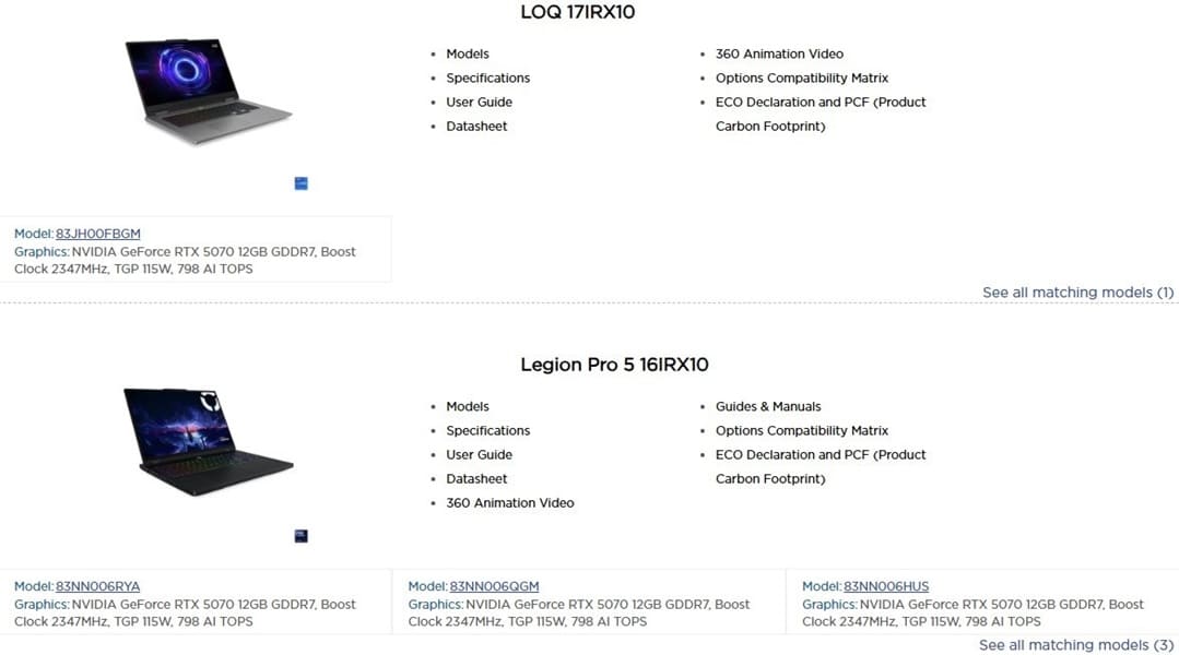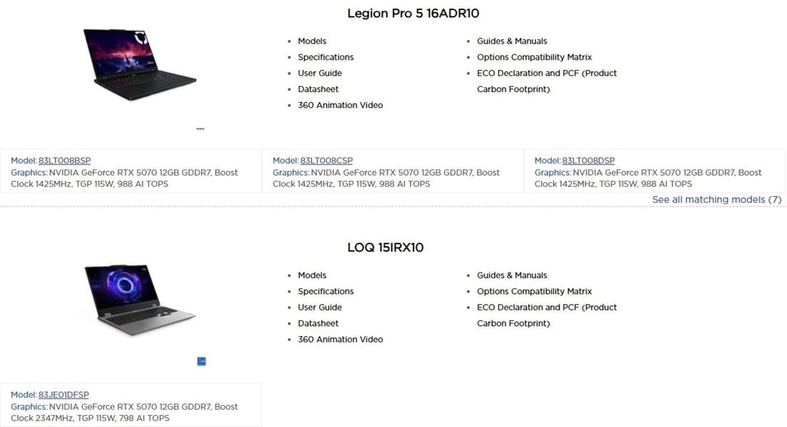 Pese a que parte de la información resulta coherente, algunos listados presentan inconsistencias claras. En un modelo Legion Pro 5, se mencionan 988 AI TOPS, frente a los 798 AI TOPS habituales en esta GPU, además de una frecuencia de 1.425 MHz que corresponde al reloj base y no al boost clock, lo que indica posibles errores en la configuración interna o en el etiquetado de las especificaciones.