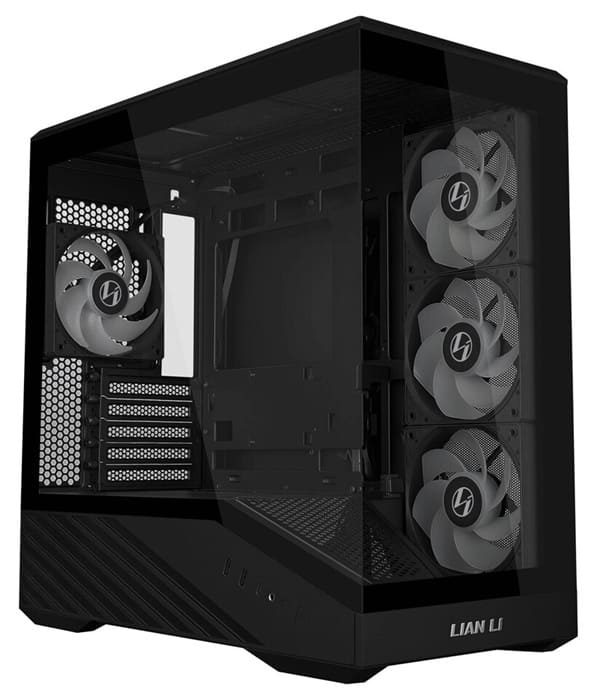 Este planteamiento permite configurar flujos de aire agresivos o perfiles más silenciosos, manteniendo temperaturas estables incluso en sistemas de alto rendimiento. En el caso de la V100R MINI, Lian Li incluye de serie 4 ventiladores ARGB PWM de 120 mm, con 3 unidades de entrada lateral invertida y 1 ventilador trasero de salida.
