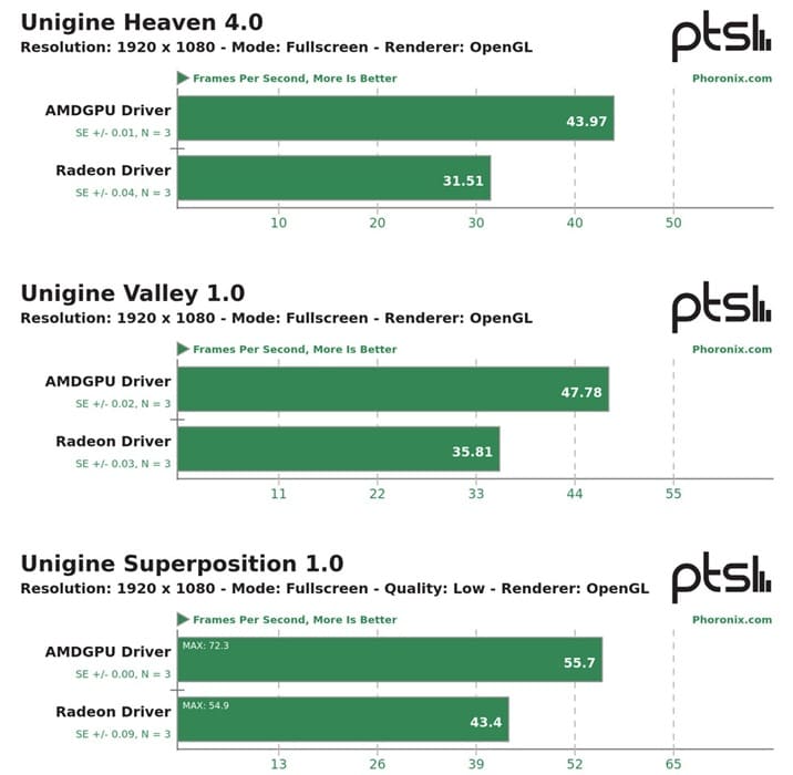 Phoronix realizó las pruebas utilizando una AMD Radeon HD 7900 con 3 GB de VRAM, perteneciente a la familia Southern Islands y lanzada hace 13 años. Con el nuevo driver por defecto, AMDGPU superó al controlador Radeon en todas las pruebas, sin excepción.