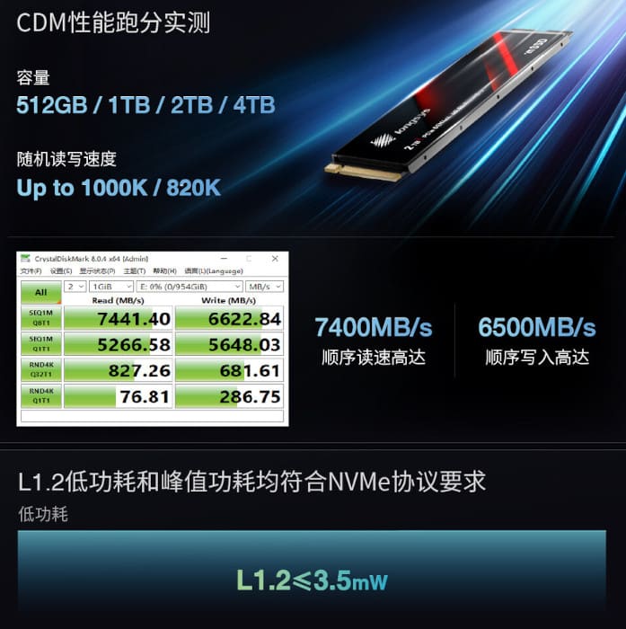 A pesar de su tamaño extremadamente reducido —20 × 30 × 2,0 mm y un peso de solo 2,2 g—, el micro SSD ofrece rendimiento completo PCIe Gen 4 ×4, alcanzando velocidades de lectura secuencial de hasta 7.400 MB/s y escrituras de hasta 6.500 MB/s. En tareas aleatorias 4K, logra hasta 1.000K / 820K IOPS, equiparándose a unidades M.2 de gama alta.