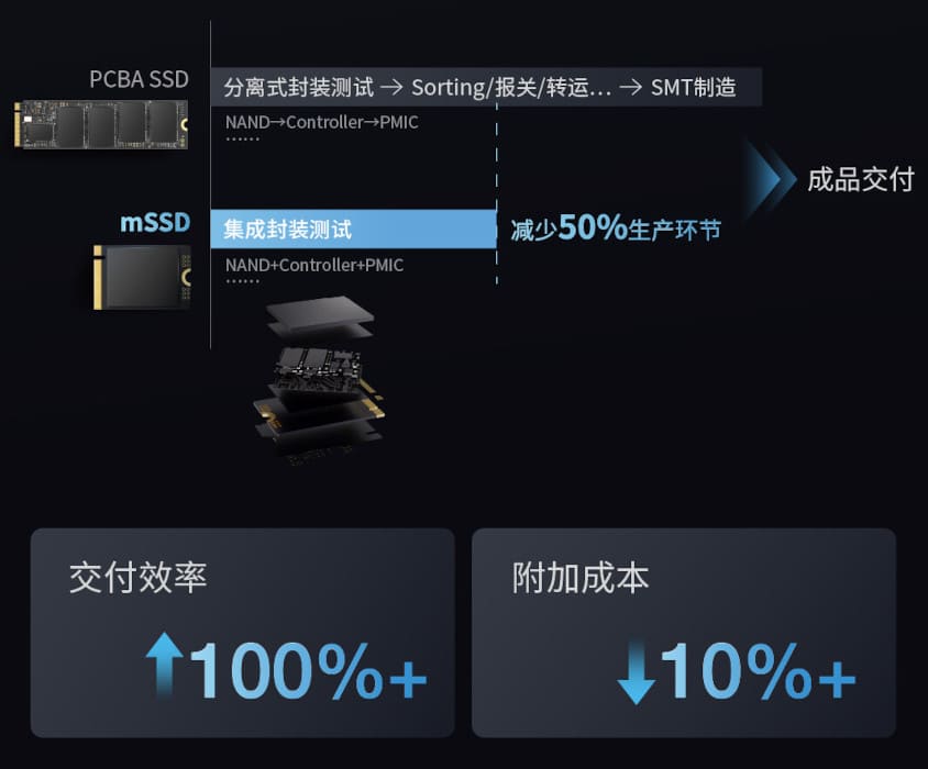 Gracias a esta integración, se eliminan cerca de 1.000 puntos de soldadura presentes en los SSD convencionales, reduciendo significativamente los posibles fallos de ensamblaje. Según la compañía, la tasa de defectos se reduce de ≤1000 DPPM a ≤100 DPPM, mejorando la fiabilidad en un 90%.