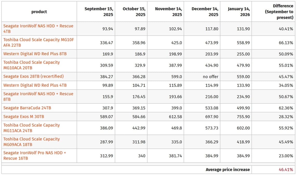 La industria del almacenamiento atraviesa un momento poco habitual. Los discos duros mecánicos (HDD) han registrado fuertes subidas de precio en los últimos meses, pese a no existir una escasez clara de componentes ni tensiones directas en el sector de semiconductores. Según datos recopilados por ComputerBase, el incremento medio desde mediados de septiembre se sitúa en torno al 46%, con variaciones significativas según capacidad y modelo.