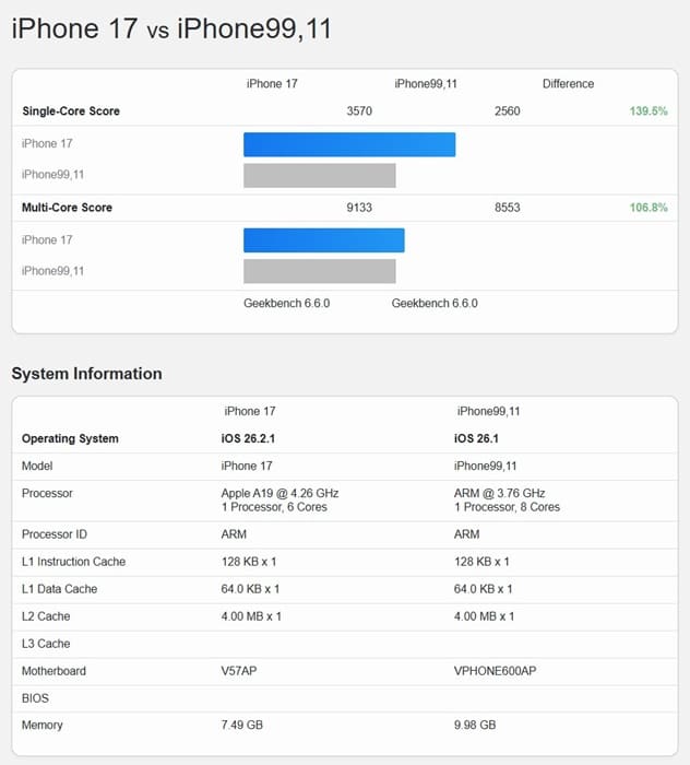 A esto se suma otro punto crítico: el benchmark menciona un A19 con CPU de 8 núcleos, cuando Apple ha mantenido de forma constante configuraciones de 6 núcleos en sus SoCs A-series durante años. Incluso en escenarios de recorte o binning, Apple nunca ha ampliado el número de núcleos de CPU en esta gama.