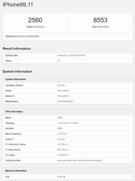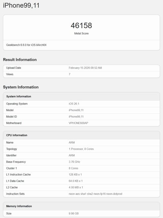 El primer gran indicio de falsificación es el identificador del dispositivo. El supuesto iPhone 17e aparece en Geekbench como iPhone99,11, una nomenclatura completamente ajena al esquema habitual de Apple. Como referencia, el iPhone 16e utiliza el identificador iPhone17,5, por lo que lo lógico sería que el nuevo modelo adoptase algo como iPhone18,5, no una designación anómala sin precedentes.
