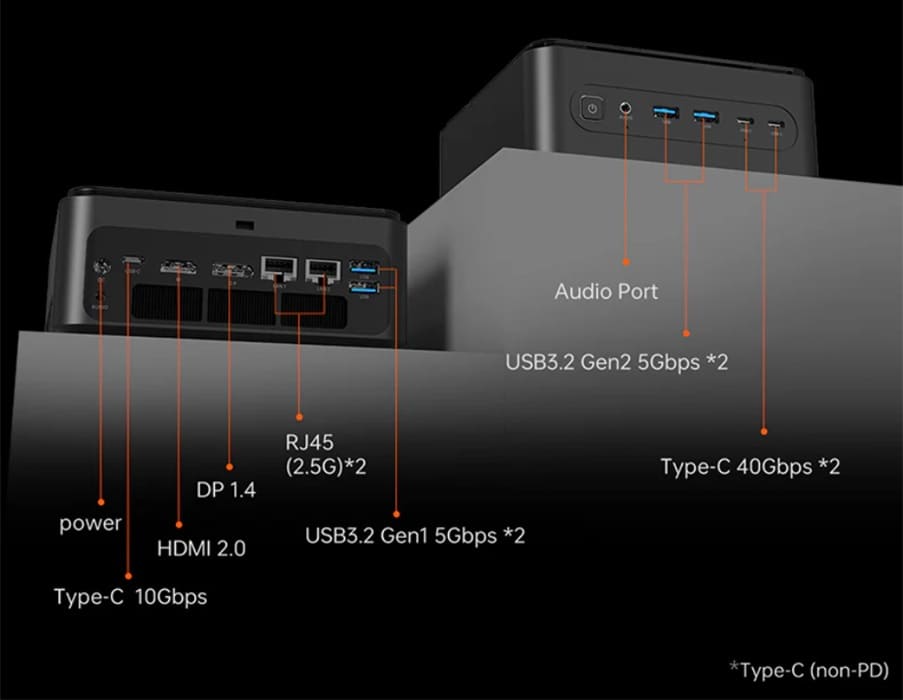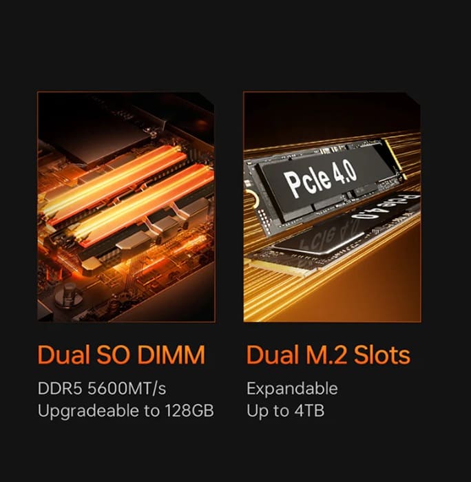 El sistema admite hasta 128 GB de RAM mediante SODIMM y hasta 2 TB a través de una unidad M.2 2280, lo que lo convierte en un mini-PC apto tanto para cargas profesionales como para usos domésticos exigentes. Su chasis compacto de 147 × 147 × 61 mm incluye una conectividad amplia con puertos de vídeo, USB, Ethernet y opciones para expansión externa.