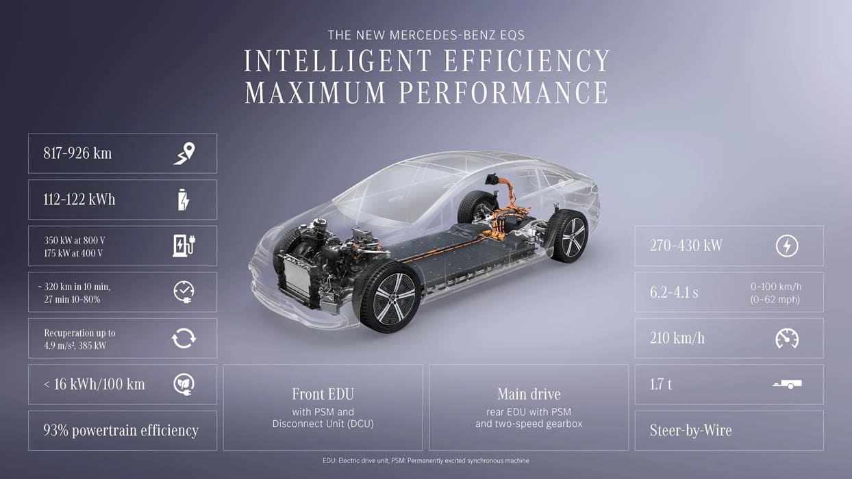 El gran salto del nuevo Mercedes EQS está en su arquitectura. El modelo adopta un sistema de 800 voltios, acompañado de nuevas unidades de propulsión, un cambio de dos velocidades en el eje trasero y baterías de mayor capacidad.