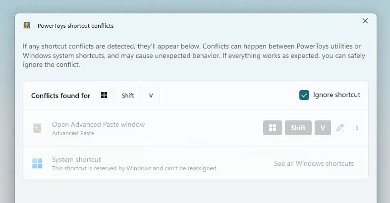 PowerToys 0.95.0 también permite ignorar conflictos de atajos de teclado o desasignarlos fácilmente, ayudando a quienes usan múltiples combinaciones personalizadas.