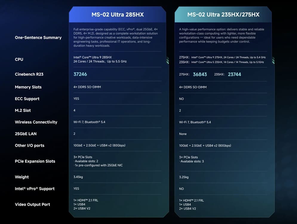 El MS-02 Ultra parte de 949 dólares (~737€) en versión barebones con Core Ultra 9 275HX, con un descuento adicional de 50 dólares usando el código MS0250. Próximamente llegará una versión más económica con Core Ultra 5 235HX por 719 dólares (~624€). El Core Ultra 9 285HX comienza en 1.119 dólares (~972€) y alcanza 2.899 dólares (~2.517€) en configuraciones con 192 GB de ECC RAM y SSD de 2 TB. Solo los modelos 285HX incluyen doble puerto 25 Gbps y soporte completo para ECC.