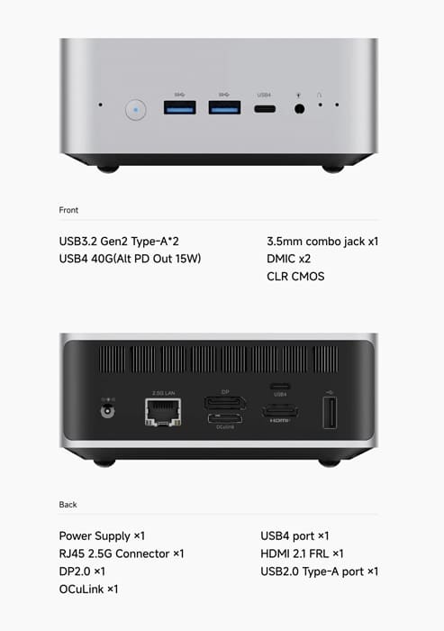 Más allá del nuevo silicio, el AI X1 permanece prácticamente sin cambios en diseño y conectividad. El equipo mantiene un chasis de 128 × 126 × 52 mm, junto a configuraciones ampliables con doble ranura SO-DIMM y almacenamiento mediante M.2 2280.