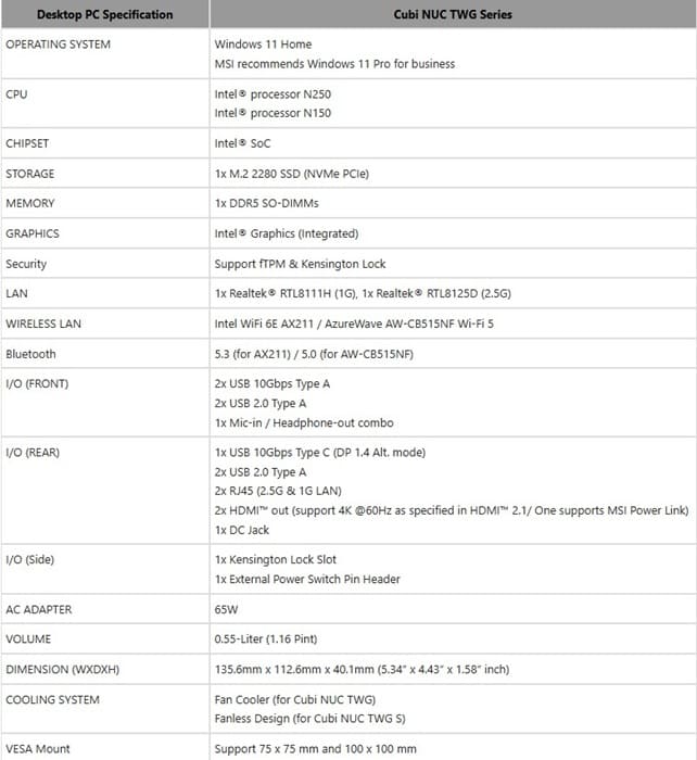 La gama se divide en dos modelos: uno con refrigeración activa mediante ventilador y otro, el Cubi NUC TWG S, que apuesta por un diseño completamente pasivo. Este último resulta especialmente interesante en entornos donde el silencio y la ausencia de vibraciones son críticos.