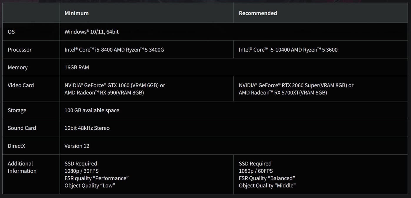 Los requisitos recomendados apuntan a 1080p y 60 FPS, con un Intel Core i5-10400 o Ryzen 5 3600, junto a una RTX 2060 Super (8 GB) o RX 5700 XT (8 GB). En ambos casos se requiere un SSD con 100 GB de espacio libre, y las configuraciones incluyen FSR en modo equilibrado y calidad de objetos media.