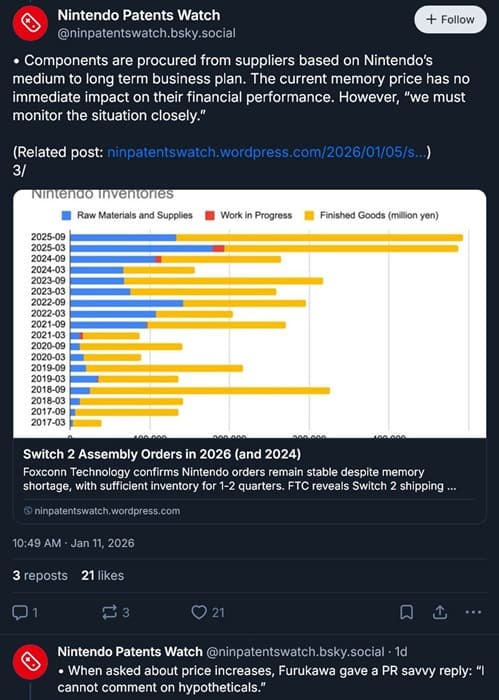 Las declaraciones, traducidas por la cuenta Patents Watch en Bluesky, apuntan a una estrategia clara por parte de la compañía japonesa: anticipación, control de inventario y prudencia comercial, al menos en el corto plazo.